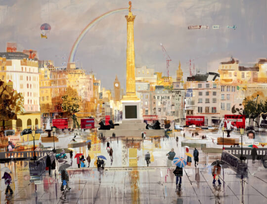 Tom Butler's stunning new release focuses on one of his favourite London scenes - a luminous view of Trafalgar Square. In a gesture of thanks and recognition to our amazing NHS, Tom has included an airborne addition to the scene alongside a rainbow which has become such a powerful symbol of hope and optimism. As with all of his show-stopping collages, this piece combines realism and impressionism to offer an innovative alternative take on modern life. The detail, charm, energy and gentle humour of his work give it enormous appeal and guarantees Tom a continued place amongst our best loved artists. Contact us to place an order.